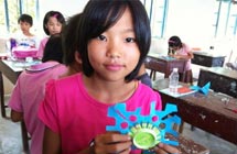 活動現場,孩子們盡情發揮自己的想象,用有限的廢紙、易拉罐等廢棄材料創造出了各種富有特色的手工藝作品。許多學生的創意作品超出了隊員們的想象,隊員們忍不住拍手叫好。雷州市烏石鎮三教小學六年級學生用日常可見的易拉罐瓶設計出簡易的小垃圾桶。將平凡的垃圾桶擬人化,還在設計出來的垃圾桶上寫著“保護環境、愛護家園”等標語。二年級學生設計出的綠色太陽花,說那是一朵綠花,那是一個希望。