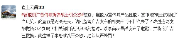 近日,“凱迪仕智能鎖”新浪微博賬號發布的一則“拆彈磚家”視頻廣告引發爭議。視頻中,為宣傳其產品“只有一只手也能開鎖”的性能,使用了“排雷戰士”被炸得粉身碎骨回到家的情節,甚至還安排了“排雷戰士”被“炸”成了綿羊、輪胎、電飯煲。江蘇省公安廳網絡安全保衛總隊官方微博批評稱,“網絡營銷應有最起碼的道德是非觀念,不要把無知當創意,把惡搞當搞笑!”