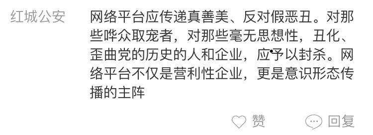 網友“紅城公安”:網絡平臺不僅是營利性企業,更是意識形態傳播的主陣地,應拿出基本責任感,傳播國家和民族的優秀文化傳統。