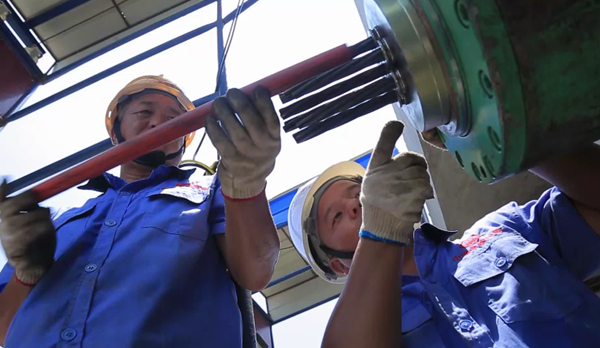 徐露平(右)研制的“鋼絞線自動穿束機”